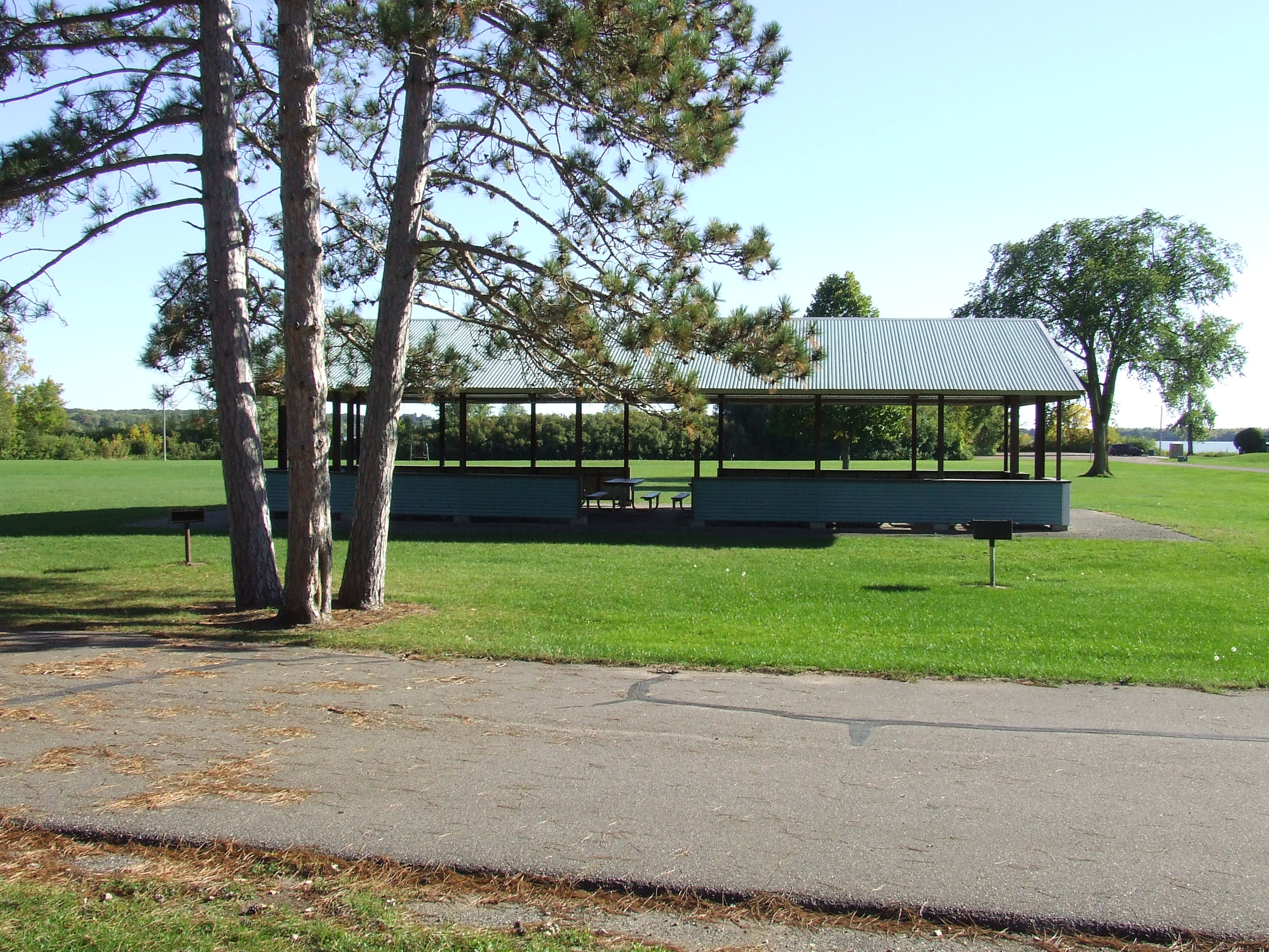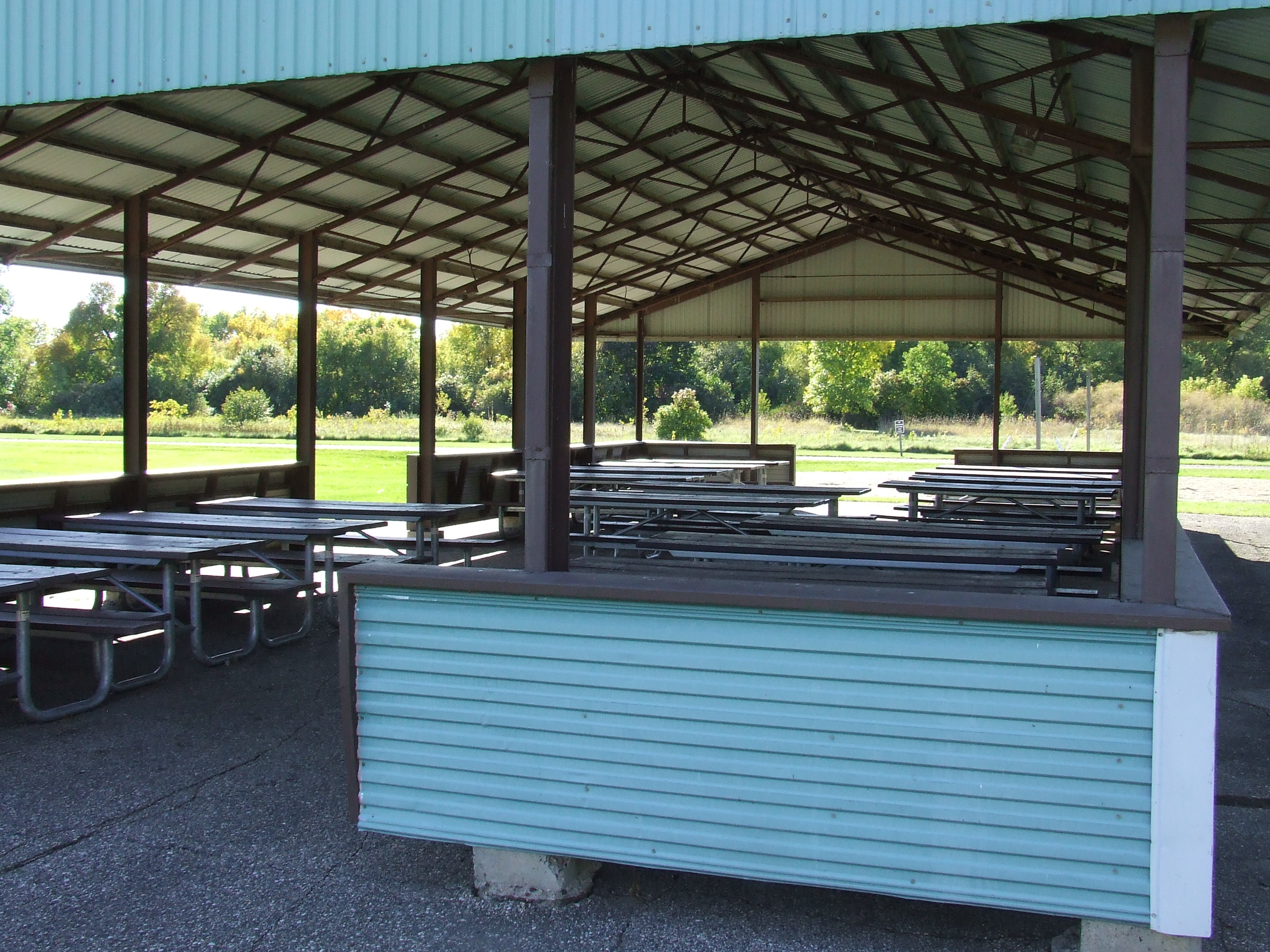 Benton Beach Small shelter is 56' long and 25' wide with 12 picnic tables inside of it and 4 outside of it. It is located on the south side of Benton Beach Campground just south of our newly upgraded playground area.